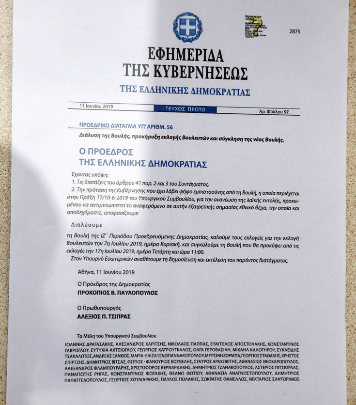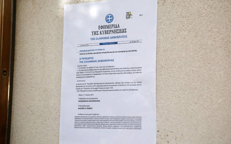 Πριν από λίγα λεπτά θυροκολλήθηκε στη Βουλή το Προεδρικό Διάταγμα για τη διάλυσή της και την προκήρυξη εκλογών.