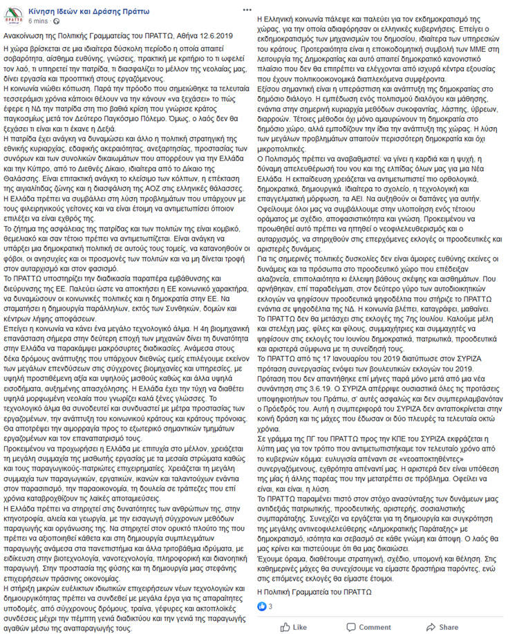 «Το ΠΡΑΤΤΩ δεν θα μετάσχει στις εκλογές της 7ης Ιουλίου. Καλούμε μέλη και στελέχη μας, φίλες και φίλους, συμμαχήτριες και συμμαχητές να ψηφίσουν στις εκλογές του Ιουνίου δημοκρατικά, πατριωτικά, προοδευτικά και αριστερά σύμφωνα με τη συνείδησή τους.