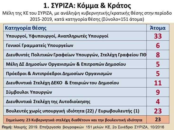Το καταστατικό του κόμματος, στο άρθρο 27, που υποτίθεται ότι ρυθμίζει τις «σχέσεις του ΣΥΡΙΖΑ με το κράτος και την κυβέρνηση», αναφέρει στο εδάφιο 1: «1. Ο ΣΥΡΙΖΑ, ως μαζικό δημοκρατικό κόμμα της Αριστεράς, στηρίζεται στις κοινωνικές δυνάμεις και δεν εξαρτά την επιβίωσή του από κάθε είδους σχέση με τους κρατικούς μηχανισμούς». (…) και παρακάτω προβλέπει: «3. Ο ΣΥΡΙΖΑ στην περίπτωση που συμμετάσχει στη διακυβέρνηση της χώρας, διατηρεί σε κάθε περίπτωση την οργανωτική και πολιτική του αυτονομία έναντι της κυβέρνησης και του κράτους. (…) Τα στελέχη που κατέχουν αμειβόμενη κυβερνητική θέση ή αξίωμα (μέλος Υπουργικού Συμβουλίου ή μέλος ΔΣ Δημόσιου Οργανισμού / Διεθνούς Οργανισμού ή Ανεξάρτητης Αρχής / ΔΕΚΟ / ΝΠΔΔ / Γενικοί και Ειδικοί Γραμματείς Υπουργείων, Υφυπουργοί), δεν μπορεί να υπερβαίνουν το 25% των μελών κάθε οργάνου του κόμματος. Τι συνέβη, όμως, στην πραγματικότητα; Η Κεντρική Επιτροπή που εκλέχθηκε στο 2ο Συνέδριο του κόμματος, τον Οκτώβριο του 2016, αριθμεί 151 μέλη. Από αυτά, τα 104, δηλαδή 7 στα 10 (ποσοστό 68%) ανέλαβαν στην περίοδο 2015-2019 κάποια κυβερνητική/κρατική θέση (Διαγράμματα 1 και 2). Αναλυτικότερα, με βάση τις εμφανείς ιδιότητές τους, που είναι δημόσια καταγεγραμμένες, προκύπτει ότι στα μέλη της ΚΕ του κόμματος περιλαμβάνονται: 33 Υπουργοί, Υφυπουργοί και Αναπληρωτές Υπουργοί, 6 Γενικοί Γραμματείς Υπουργείων, 8 Διευθυντές πολιτικών γραφείων Υπουργών και στελέχη του Γραφείου του Πρωθυπουργού, 5 Μέλη ΔΣ Δημοσίων Οργανισμών & Επιτροπών Δημοσίου, 5 Πρόεδροι & Αντιπρόεδροι Δημοσίων Οργανισμών, 3 Διευθυντικά Στελέχη ΔΕΚΟ και 8 στελέχη Εταιριών του Δημοσίου, 9 Σύμβουλοι Υπουργών, 4 Διευθυντικά στελέχη της Αυτοδιοίκησης, 22 Βουλευτές και 1 Ευρωβουλευτής. Ας σημειωθεί ότι 23 κυβερνητικά στελέχη διαθέτουν επίσης την βουλευτική ιδιότητα. Η επικάλυψη Κεντρικής Επιτροπής και Κοινοβουλευτικής Ομάδας (ΚΟ) είναι μεγάλη, με δεδομένο ότι το 30,5% των μελών της, σχεδόν 1 στα 3, είναι και βουλευτές (Συνολικά, ο αριθμός των βουλευτών/ ευρωβουλευτών ανέρχεται σε 46 – Διάγραμμα 2).