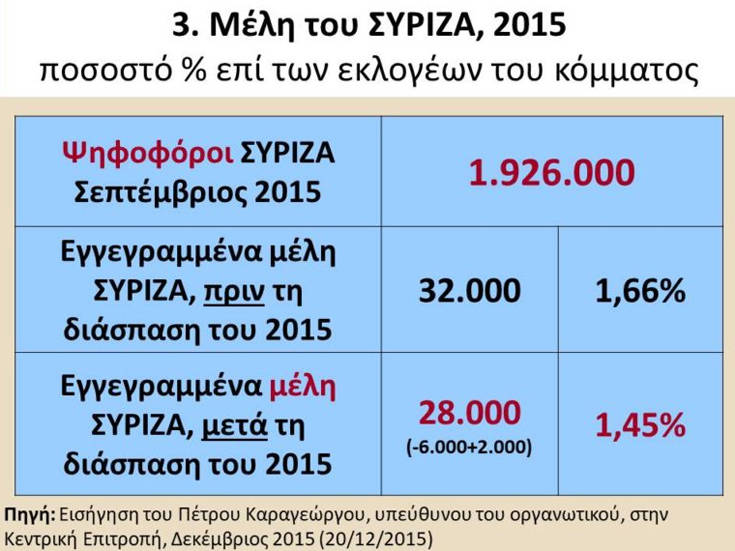 Τι αντιπροσωπεύει σήμερα η οργανωμένη κομματική βάση του ΣΥΡΙΖΑ; Τα στοιχεία, σχετικά με τα κομματικά μέλη είναι συντριπτικά. Στη δεύτερη εκλογική νίκη του κόμματος, τον Σεπτέμβριο του 2015, οι ψηφοφόροι του ΣΥΡΙΖΑ έφθασαν τα 1.926.000 άτομα, ποσοστό 35,5%. Με βάση τα επίσημα στοιχεία, τα εγγεγραμμένα μέλη του ΣΥΡΙΖΑ, πριν τη διάσπαση του 2015, έφθαναν τις 32.000. Με τη διάσπαση αποχώρησαν περίπου 6.000 μέλη και στρατολογήθηκαν περίπου 2.000 νέα. Επομένως, μετά τη διάσπαση του 2015, τα εγγεγραμμένα μέλη του ΣΥΡΙΖΑ υπολογίσθηκαν σε 28.000 άτομα (-6.000+2.000). Ως προς την εκλογική βάση (τους ψηφοφόρους) του κόμματος, αυτοί οι αριθμοί αντιπροσώπευαν το 2015 μηδαμινά ποσοστά, αντίστοιχα, μόλις το 1,66% και το 1,45% (Διάγραμμα 3).
