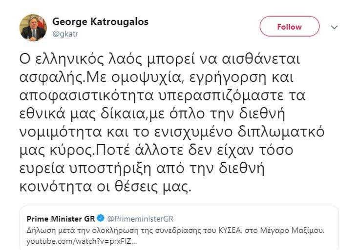 «Ο ελληνικός λαός μπορεί να αισθάνεται ασφαλής», ανέφερε σε ανάρτησή του στο Twitter ο Γιώργος Κατρούγκαλος, με αφορμή τη σημερινή συνεδρίαση του ΚΥΣΕΑ υπό τον πρωθυπουργό, Αλέξη Τσίπρα.