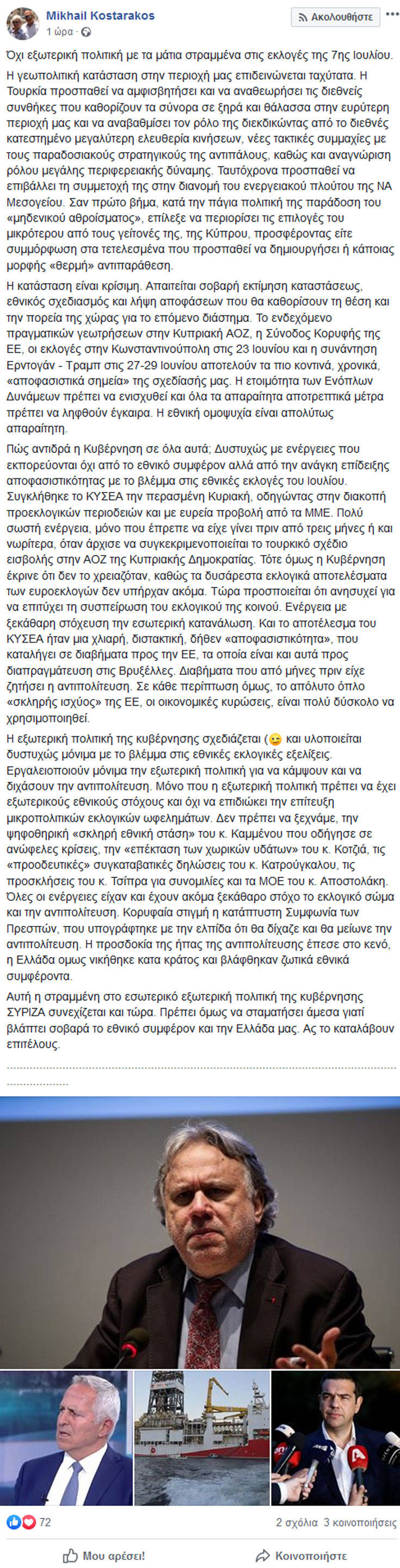 Να μην γίνεται εξωτερική πολιτική «με τα μάτια στραμμένα στις εκλογές της 7ης Ιουλίου», αναφέρει, μεταξύ άλλων, σε ανάρτησή του στο Facebook o επίτιμος Αρχηγός ΓΕΕΘΑ και πρώην πρόεδρος της Στρατιωτικής Επιτροπής της Ε.Ε., Μιχάλης Κωσταράκος.