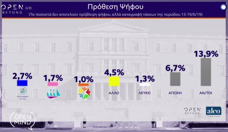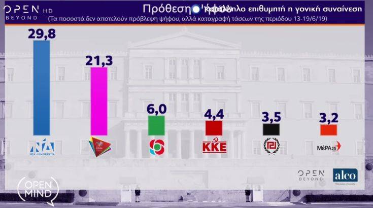 Η πρόθεση ψήφου και η διαφορά μεταξύ ΝΔ και ΣΥΡΙΖΑ, δυο εβδομάδες πριν τις εκλογές, διαμορφώνεται στις 7,5 μονάδες. Η ΝΔ 34 παίρνει το ενώ ο ΣΥΡΙΖΑ 26,5. Το ΚΙΝΑΛ ακολουθεί με 6,5, το ΚΚΕ 5,5, με 4,5 Χρυσή Αυγή, το ΜέΡΑ25 παίρνει 3,5 ενώ η Ελληνική Λύση 3.