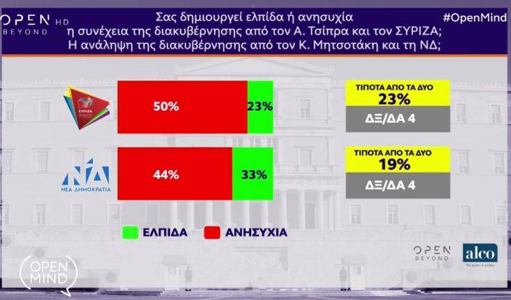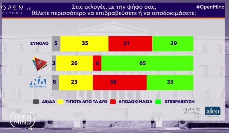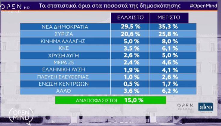 Η δημοσκόπηση Alco για τις επερχόμενες εθνικές εκλογές παρουσιάστηκε χθες το βράδυ στο Open, για λογαριασμό της εκπομπής «Open Mind» που παρουσιάζει η δημοσιογράφος Έλλη Στάη.