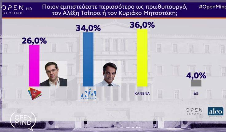 Στην καταλληλότητα για την πρωθυπουργία προηγείται ο Κ. Μητσοτάκης με 36% και ακολουθεί ο Α. Τσίπρας με 28%. Κανένας από τους δύο απάντησε το 32%.