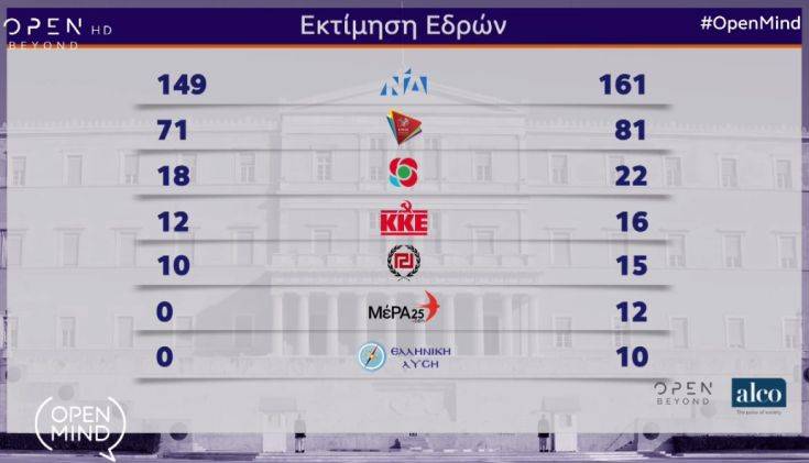 Με βάση αυτά τα δεδομένα, και όπως τόνισε και ο διευθύνων σύμβουλος της Alco Κώστας Παναγόπουλος, που προχώρησε σε μια εκτίμηση εδρών, η Νέα Δημοκρατία πετυχαίνει αυτοδύναμη κυβέρνηση, σημειώνοντας, μάλιστα, πως θα είναι έκπληξη αν δεν συμβεί κάτι τέτοιο…