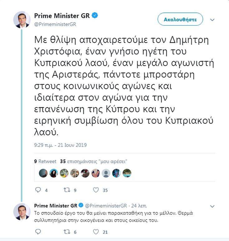 «Με θλίψη αποχαιρετούμε τον Δημήτρη Χριστόφια, έναν γνήσιο ηγέτη του Κυπριακού λαού, έναν μεγάλο αγωνιστή της Αριστεράς, πάντοτε μπροστάρη στους κοινωνικούς αγώνες και ιδιαίτερα στον αγώνα για την επανένωση της Κύπρου και την ειρηνική συμβίωση όλου του Κυπριακού λαού».