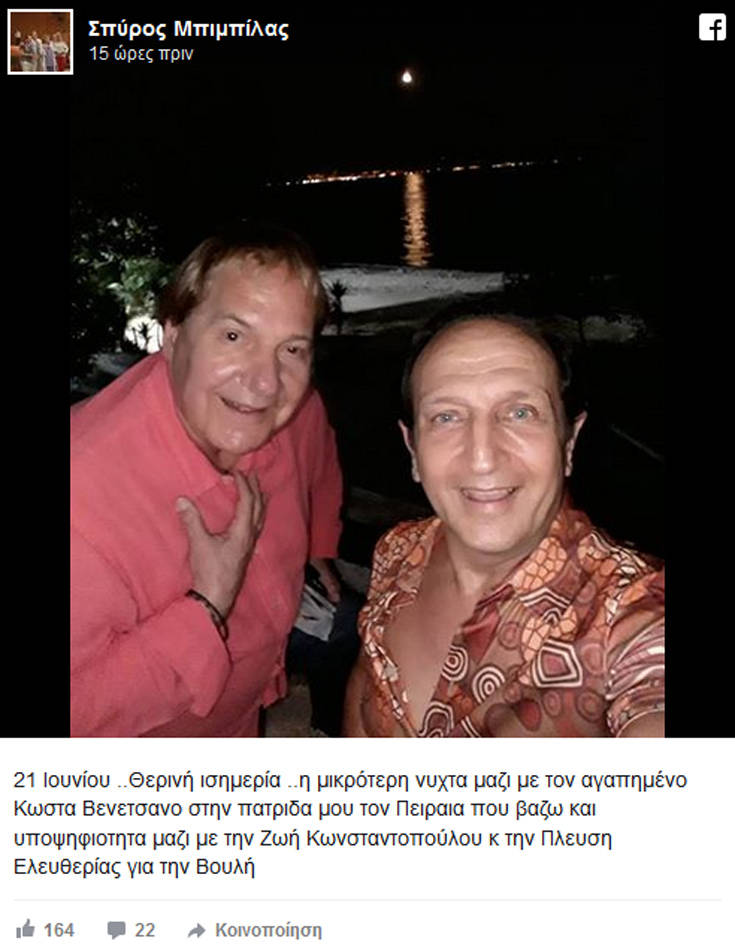 «21 Ιουνίου Θερινή ισημερία η μικρότερη νυχτα μαζι με τον αγαπημένο Κωστα Βενετσανο στην πατριδα μου τον Πειραιά που βαζω και υποψηφιοτητα μαζι με την Ζωή Κωνσταντοπούλου κ την Πλευση Ελευθερίας για την Βουλή», είχε γράψει ο Σπύρος Μπιμπίλας, προσθέτοντας την σχετική φωτογραφία.