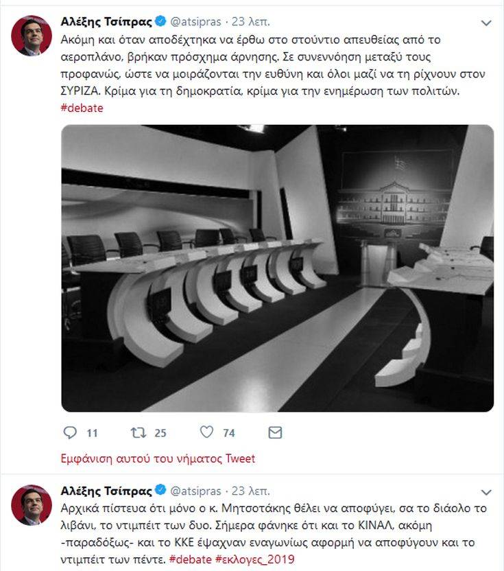 Ακόμη και όταν αποδέχτηκα να έρθω στο στούντιο απευθείας από το αεροπλάνο, βρήκαν πρόσχημα άρνησης. Σε συνεννόηση μεταξύ τους προφανώς, ώστε να μοιράζονται την ευθύνη και όλοι μαζί να τη ρίχνουν στον ΣΥΡΙΖΑ. Κρίμα για τη δημοκρατία, κρίμα για την ενημέρωση των πολιτών», τονίζει σε ανάρτησή του στον προσωπικό του λογαριασμό στο twitter, ο πρωθυπουργός, Αλέξης Τσίπρας, για τη ματαίωση του ντιμπέιτ των πέντε πολιτικών αρχηγών.