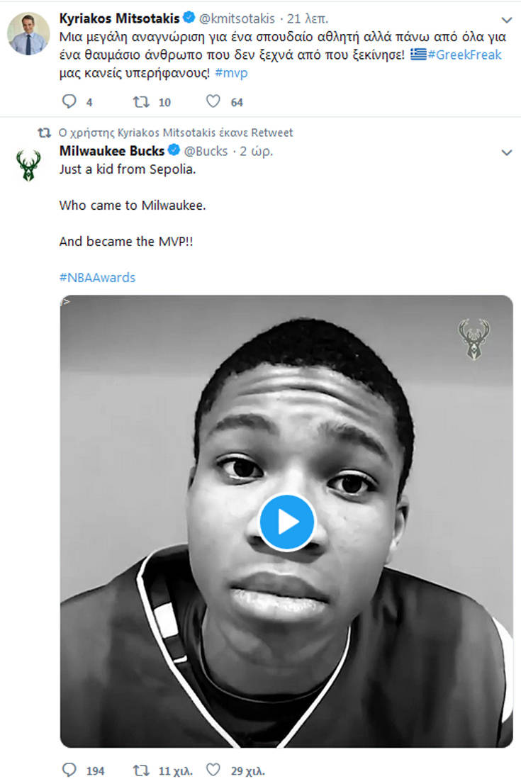 Με μία ανάρτηση στο Twitter θέλησε να συγχαρεί τον Γιάννη Αντετοκούνμπο που αναδείχθηκε ο πολυτιμότερος παίχτης του NBA ο Κυριάκος Μητσοτάκης.