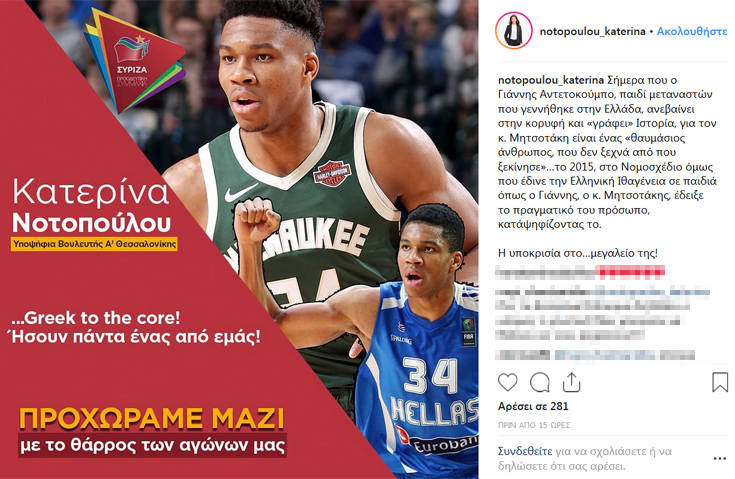 Στην μισή εικόνα φιγουράρουν δύο φωτογραφίες του μπασκετμπολίστα, μία με την φανέλα των Μπακς και μία με της Εθνικής ομάδας, ενώ στην υπόλοιποι μισή, σε κόκκινο φόντο, είναι γραμμένα τα συνθήματα της προεκλογικής καμπάνιας της Κατερίνας Νοτοπούλου: «Προχωράμε μαζί με το θάρρος των αγώνων μας», ενώ αναφορικά με τον Αντετοκούνμπο, γράφει: «…Greek to the core! Ήσουν πάντα ένας από εμάς»!