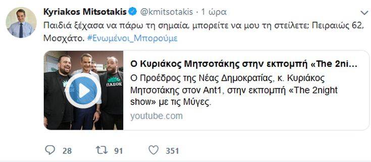 Όπως ενημέρωσε σήμερα στο Twitter ωστόσο μάλλον την ξέχασε και έτσι έγραψε: «Παιδιά ξέχασα να πάρω τη σημαία, μπορείτε να μου τη στείλετε; Πειραιώς 62, Μοσχάτο».