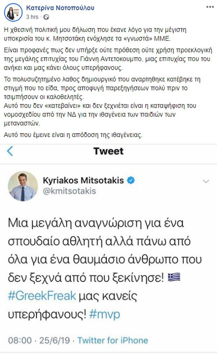 «Η χθεσινή πολιτική μου δήλωση που έκανε λόγο για την μέγιστη υποκρισία του κ. Μητσοτάκη ενόχλησε τα “γνωστά” ΜΜΕ», έγραψε στο Facebook η Κατερίνα Νοτοπούλου και αναφερόμενη στην αφίσα με τον Γιάννη Αντετοκούνμπο υποστήριξε πως «είναι προφανές πως δεν υπήρξε ούτε πρόθεση ούτε χρήση προεκλογική της μεγάλης επιτυχίας του».