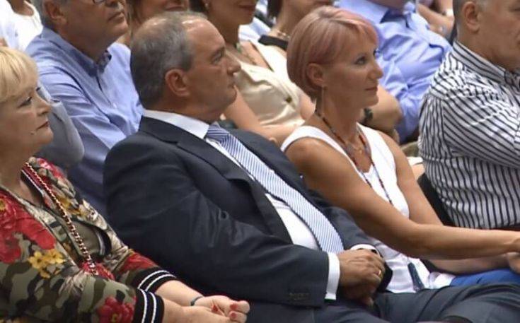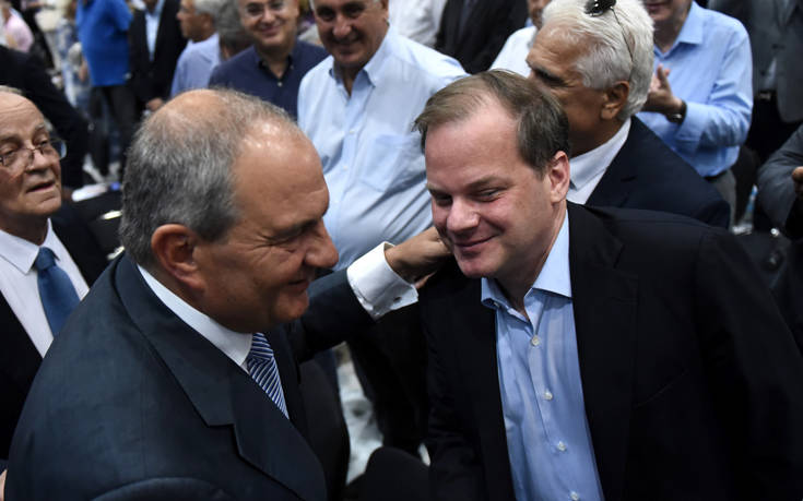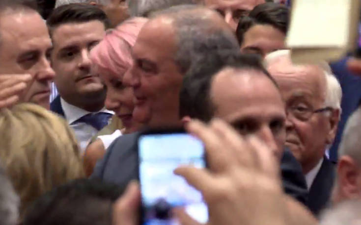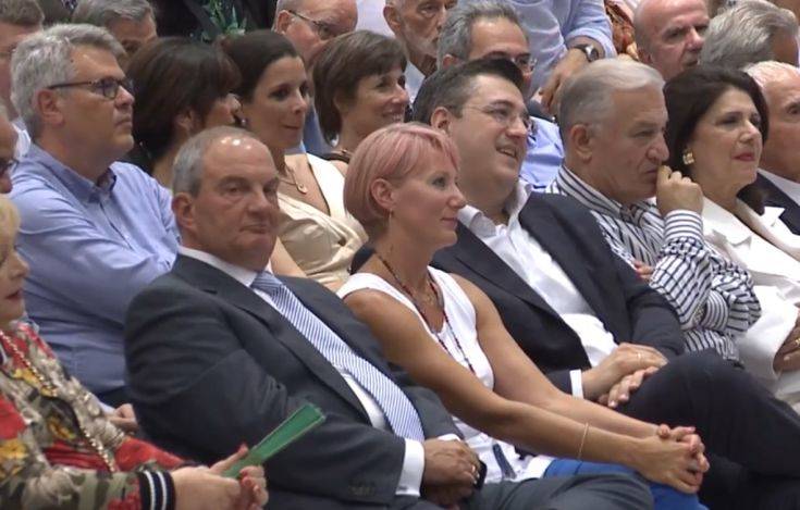 Στο πλευρό του πρώην πρωθυπουργού ξεχώρισε η σύζυγός του Νατάσα Παζαΐτη με το ροζ χρώμα στα μαλλιά ενώ ο Κώστας Καραμανλής έκανε πολλά λεπτά να φτάσει από την είσοδο του συνεδριακού μέχρι το βήμα της εκδήλωσης από τις εκδηλώσεις θαυμασμού των φίλων της ΝΔ.
