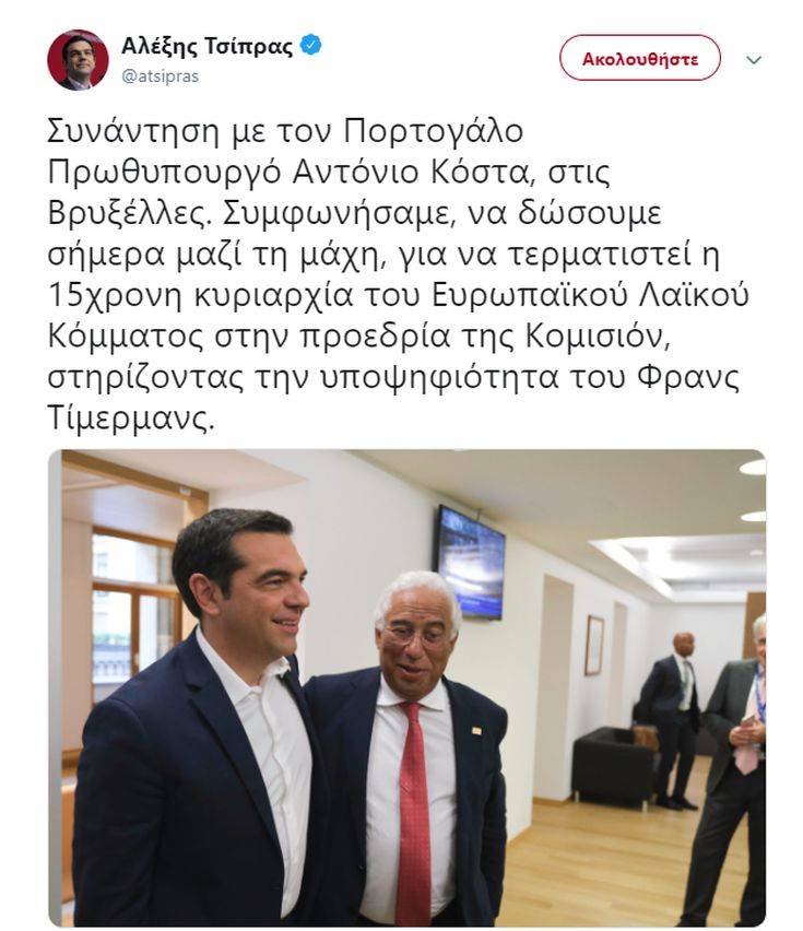 «Συμφωνήσαμε, να δώσουμε σήμερα μαζί τη μάχη, για να τερματιστεί η 15χρονη κυριαρχία του Ευρωπαϊκού Λαϊκού Κόμματος στην προεδρία της Κομισιόν, στηρίζοντας την υποψηφιότητα του Φρανς Τίμερμανς», έγραψε σε ανάρτησή του στο twitter ο κ. Τσίπρας.