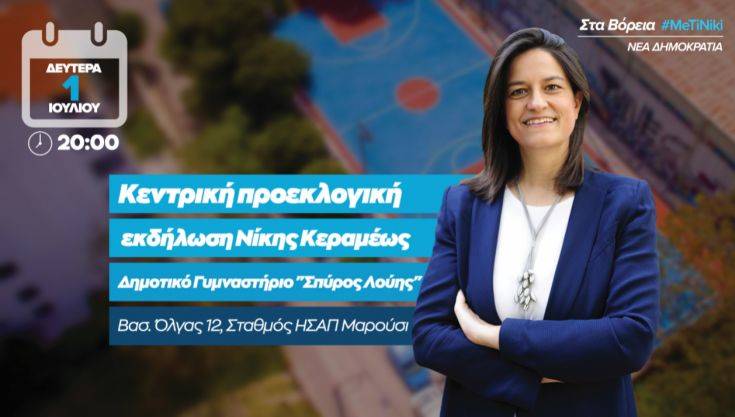 Αντίστροφα μετρά ο χρόνος για τις εθνικές εκλογές της 7ης Ιουλίου και η υποψήφια βουλευτής της Νέας Δημοκρατίας στο Βόρειο Τομέα της Β’ Αθηνών, Νίκη Κεραμέως, πραγματοποιεί σήμερα, 1η Ιουλίου, στις 20:00, την κεντρική προεκλογική της εκδήλωση στο δημοτικό γυμναστήριο «Σπύρος Λούης» στο Μαρούσι.