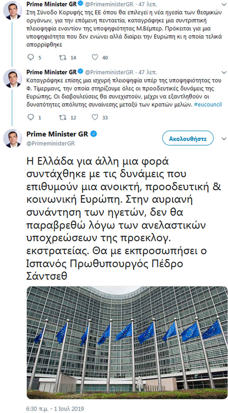 «Οι διαβουλεύσεις θα συνεχιστούν, μέχρι να εξαντληθούν οι δυνατότητες απόλυτης συναίνεσης μεταξύ των κρατών μελών. Η Ελλάδα για άλλη μια φορά συντάχθηκε με τις δυνάμεις που επιθυμούν μια ανοικτή, προοδευτική και κοινωνική Ευρώπη. Στην αυριανή συνάντηση των ηγετών, δεν θα παραβρεθώ λόγω των ανελαστικών υποχρεώσεων της προεκλογικής εκστρατείας. Θα με εκπροσωπήσει ο Ισπανός Πρωθυπουργός Πέδρο Σάντσεθ».