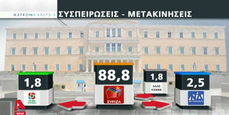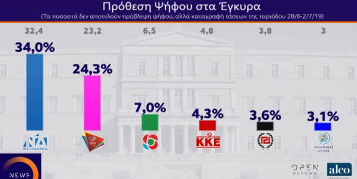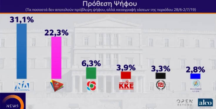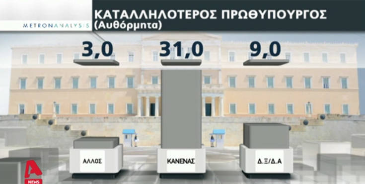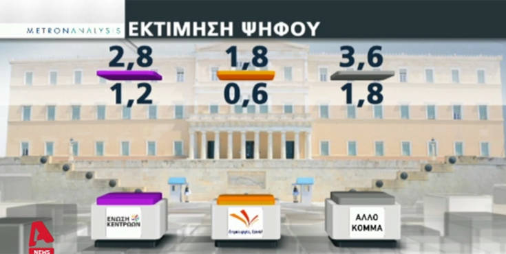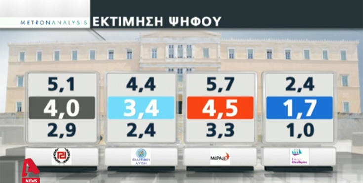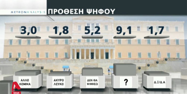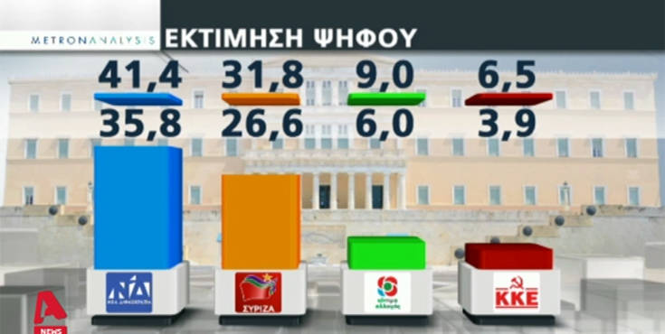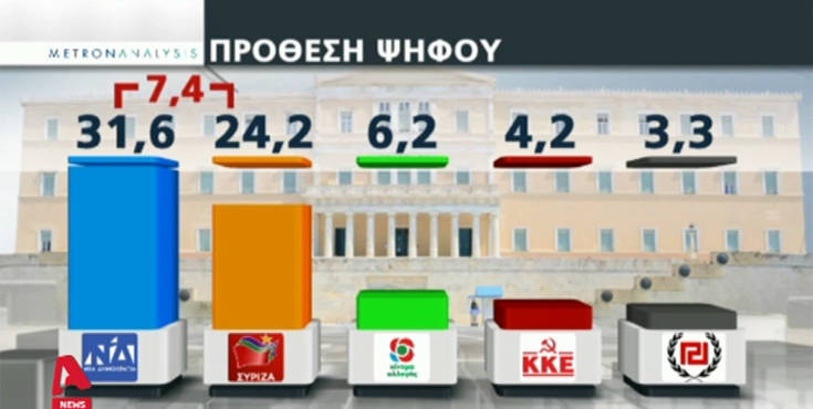 Προβάδισμα της Νέας Δημοκρατίας με 31,6% έναντι 24,2% του ΣΥΡΙΖΑ δείχνει νέα δημοσκόπηση της Metron Analysis για τον τηλεοπτικό σταθμό Alpha με φόντο τις εθνικές εκλογές της 7ης Ιουλίου.