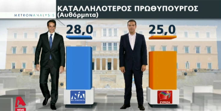 Καταλληλότερο πρωθυπουργό θεωρεί τον Κυριάκο Μητσοτάκη το 28% και τον Αλέξη Τσίπρα το 25%, ενώ «κανένας» απάντησε το 31% των ερωτηθέντων.