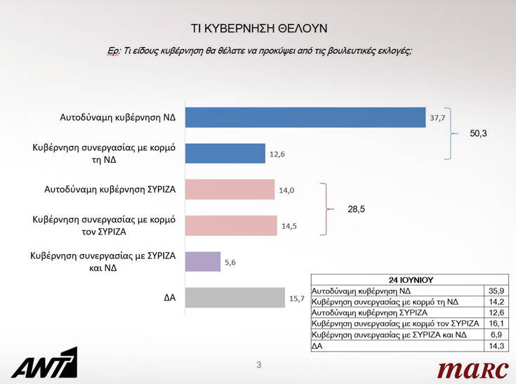 Στην ερώτηση τι κυβέρνηση θέλουν οι πολίτες απαντούν σε ποσοστό 37, 3% αυτοδύναμη κυβέρνηση της ΝΔ ενώ ένα ποσοστό 12,6% απαντά κυβέρνηση συνεργασίας με κορμό τη ΝΔ. Ένα 12% επιθυμεί αυτοδύναμη κυβέρνησης ΣΥΡΙΖΑ με 14,0% ενώ ένα 14,5% θέλει κυβέρνηση συνεργασίας με κορμό τον ΣΥΡΙΖΑ.