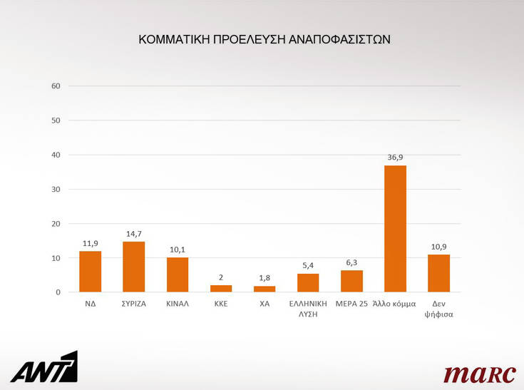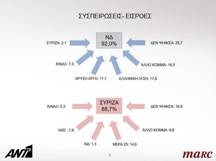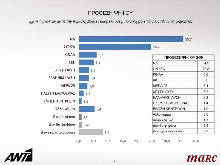 Συγκεκριμένα, στην πανελλαδική δημοσκόπηση της Marc που διενεργήθηκε για λογαριασμό του Ant1 από τις 2 έως τις 4 Ιουλίου, σε δείγμα 1.412 νοικοκυριών, η πρόθεση ψήφου διαμορφώνεται ως εξής: ΝΔ 35,7%, ΣΥΡΙΖΑ 24,7%, ΚΙΝΑΛ 6,1%, ΚΚΕ 5,1%, Χρυσή Αυγή 3,5%, Ελληνική Λύση 3,4% και ΜέΡΑ 25 3,0%.