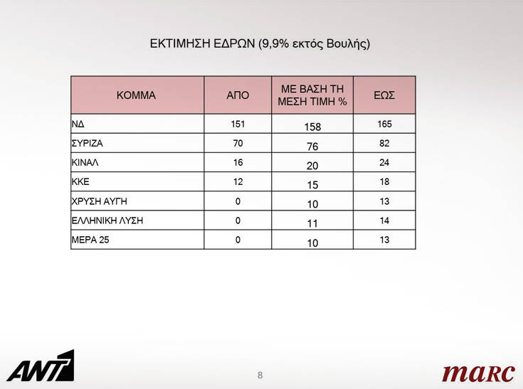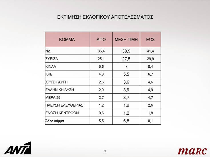 Σε ό,τι αφορά την εκτίμηση εκλογικού αποτελέσματος η ΝΔ λαμβάνει από 36,4% έως 41,4%, ο ΣΥΡΙΖΑ από 25,1% έως 29,9%, το ΚΙΝΑΛ από 5,6% έως 8,4%, το ΚΚΕ από 4,3% έως 6,7%, η Χρυσή Αυγή από 2,6% έως 4,6% και η Ελληνική Λύση από 2,9% έως 4,9%.