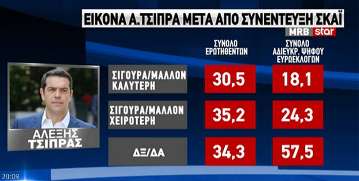 Αρχικά οι πολίτες κλήθηκαν να απαντήσουν στο αν ωφέλησε τον πρωθυπουργό η παρουσία του στο ΣΚΑΪ. Σίγουρα/μάλλον ναι απάντησε το 30,5%, σίγουρα/μάλλον όχι το 35,2%.
