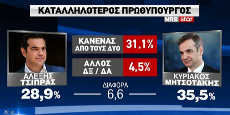 Στην καταλληλότητα για πρωθυπουργός ο κ. Μητσοτάκης παίρνει 35,5%.