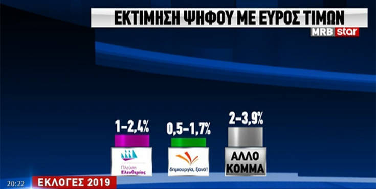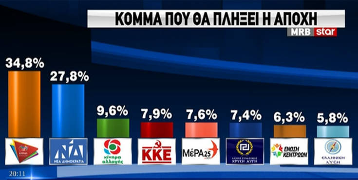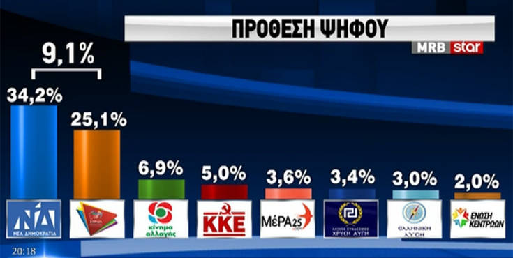 Συγκεκριμένα η ΝΔ παίρνει το 34,2%, ο ΣΥΡΙΖΑ 25,1% με το ΚΙΝΑΛ να ακολουθεί με 6,9 %. Το ΚΚΕ παίρνει 5% και η Χρυσή Αυγή 3,4%. Το Μέρα25 3,6 % και η Ελληνική Λύση 3%.