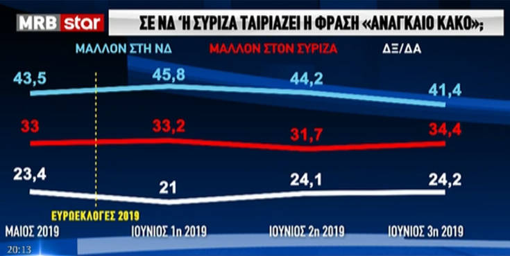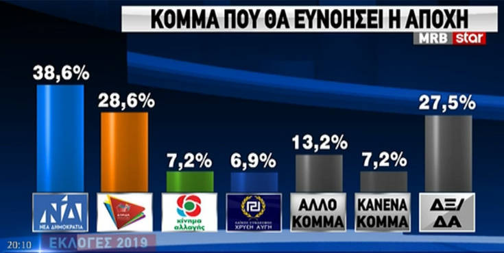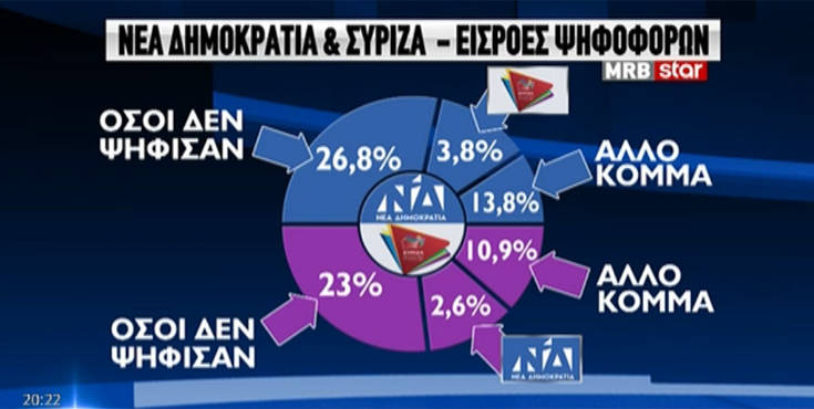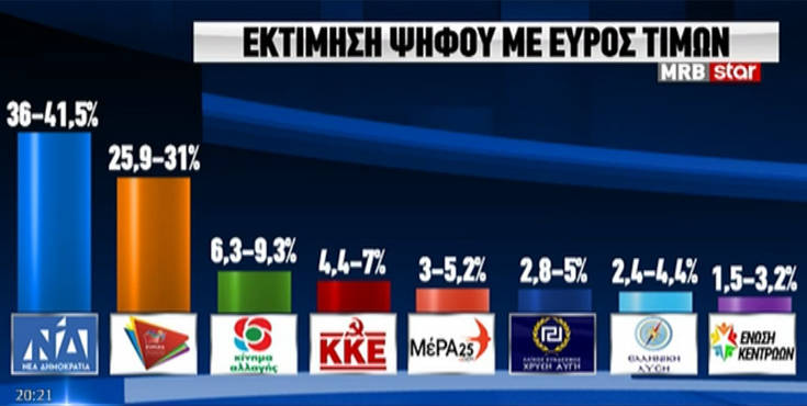 Η έρευνα της MRB, λίγες ώρες πριν τις εκλογές, δείχνει την απόσταση μεταξύ Νέας Δημοκρατίας και ΣΥΡΙΖΑ να βρίσκεται στις 9,1 μονάδες.