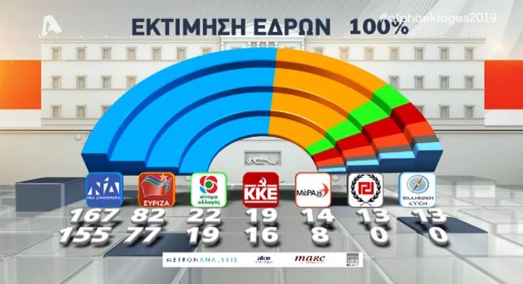 Νωρίτερα από την εκτίμηση του exit poll για τις βουλευτικές εκλογές 2019, στο 80% φαίνεται πως η Νέα Δημοκρατία καταγράφει μια σημαντική νίκη, ενώ ο ΣΥΡΙΖΑ μια μεγάλη ήττα, κρατώντας πάντως δυνάμεις. Τα ίδια στοιχεία δείχνουν αυτοδυναμία της Νέας Δημοκρατίας με 155 έως 167 έδρες.