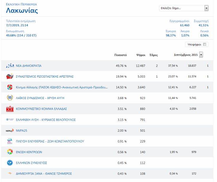 Σπάει όλα τα κοντέρ η διαφορά μεταξύ της Νέας Δημοκρατίας και του ΣΥΡΙΖΑ στη Λακωνία καθώς σχεδόν στο 49,68% της ενσωμάτωσης και με 154 στα 310 εκλογικά τμήματα καταμετρημένα η απόσταση των δύο κομμάτων είναι 29,82 μονάδες