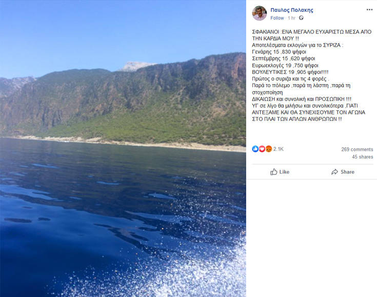 Μέσω Facebook σχολίασε ο Παύλος Πολάκης τα αποτελέσματα των εθνικών εκλογών. Ο Παύλος Πολάκης που έδινε μάχη σώμα με σώμα με τον Γιώργο Σταθάκη για να μπει στη Βουλή, τελικά τα κατάφερε και εκλέχθηκε.