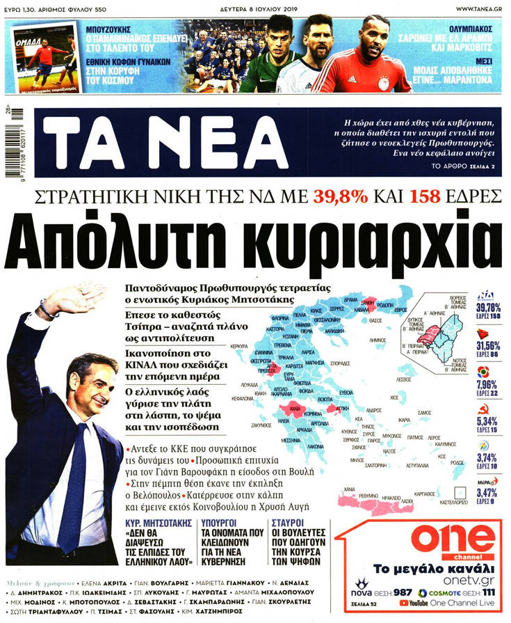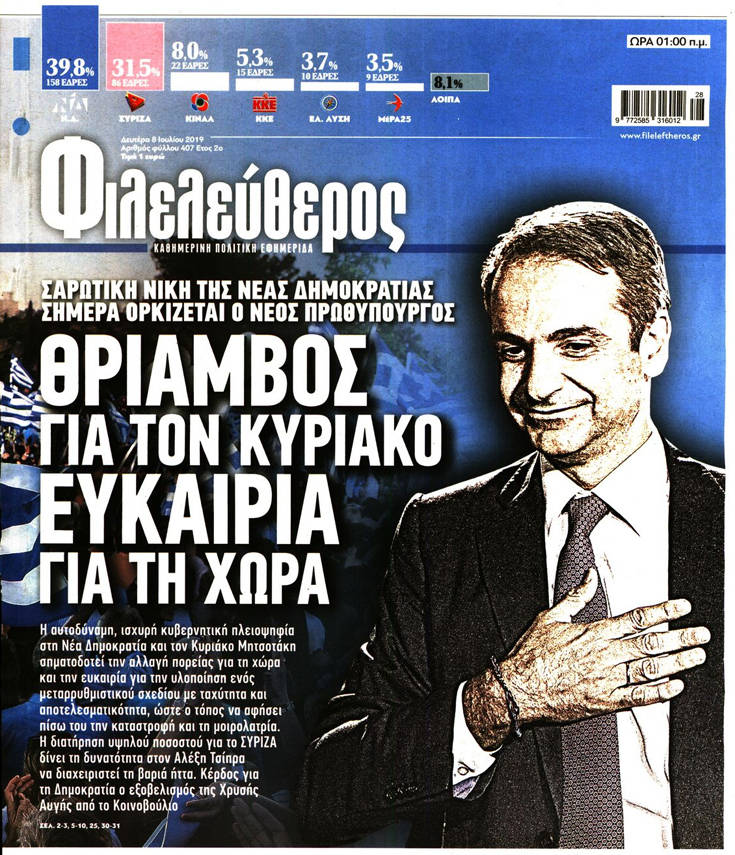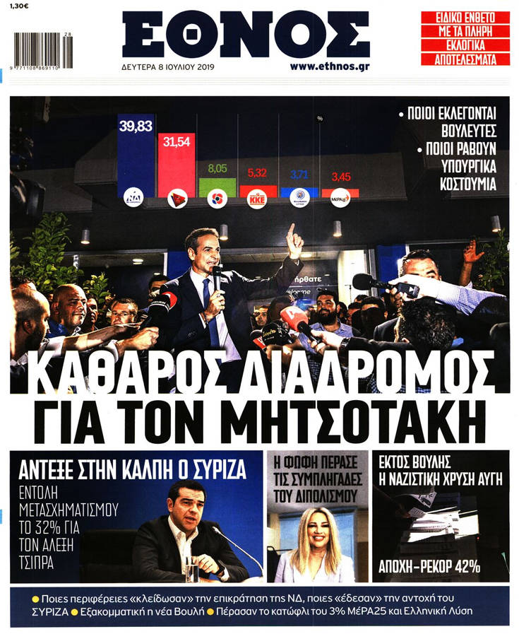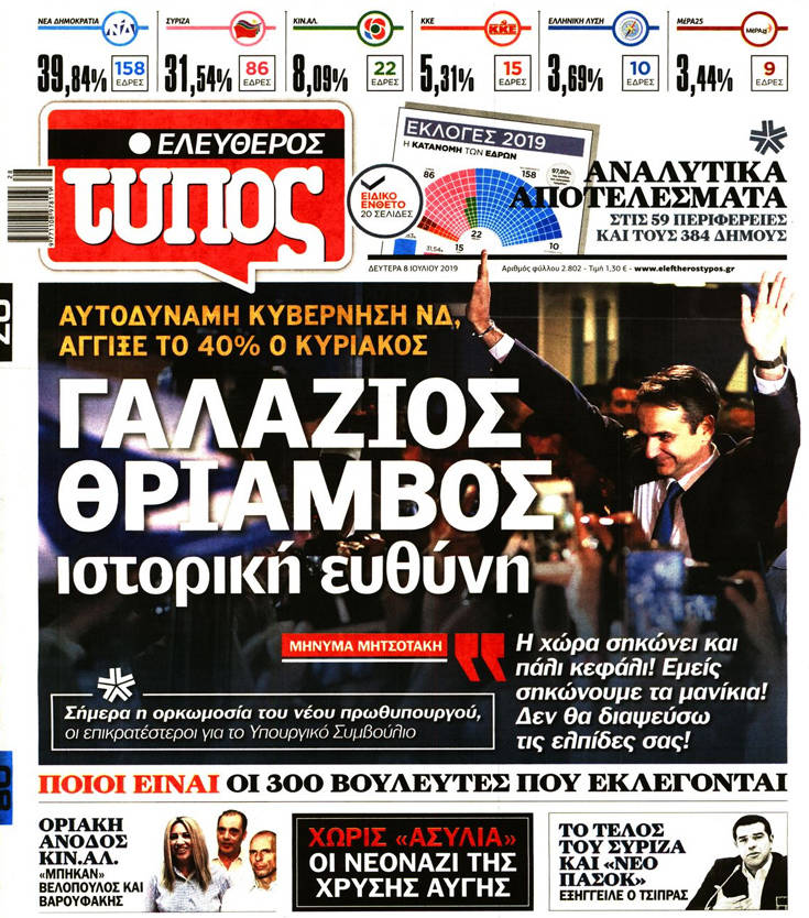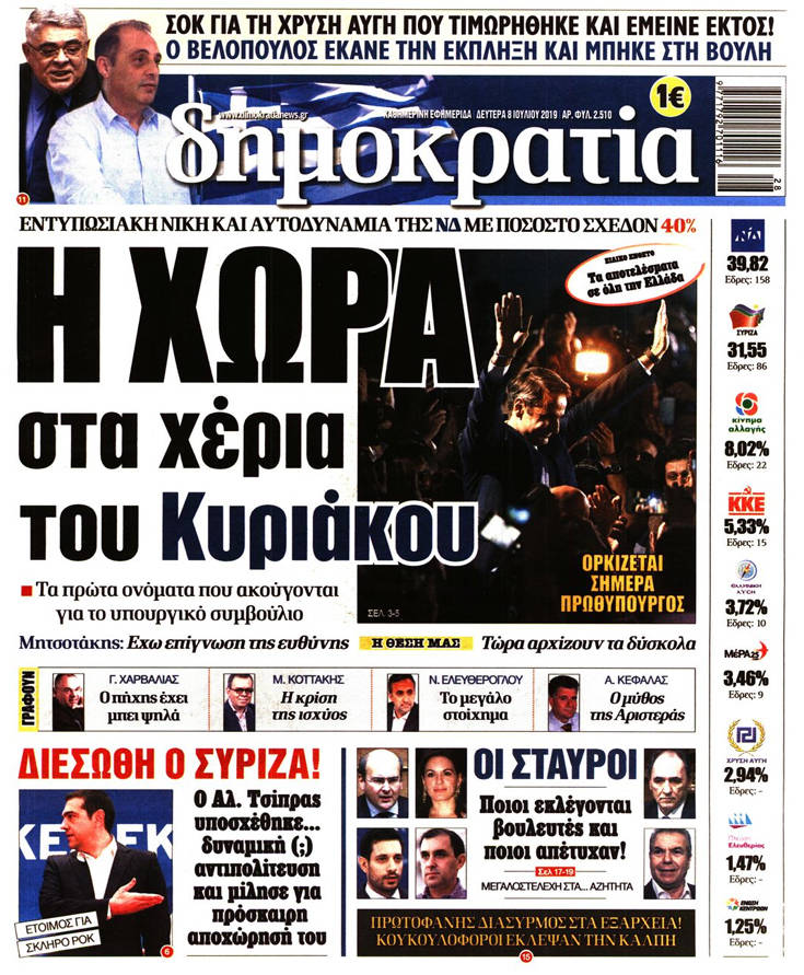 Η νίκη της Νέας Δημοκρατίας στις εθνικές εκλογές, τα υψηλά, παρά την ήττα, ποσοστά του ΣΥΡΙΖΑ, κυριαρχούν στα πρωτοσέλιδα των σημερινών εφημερίδων.