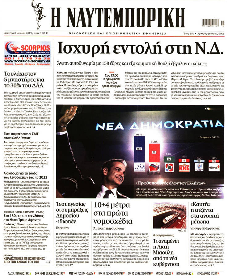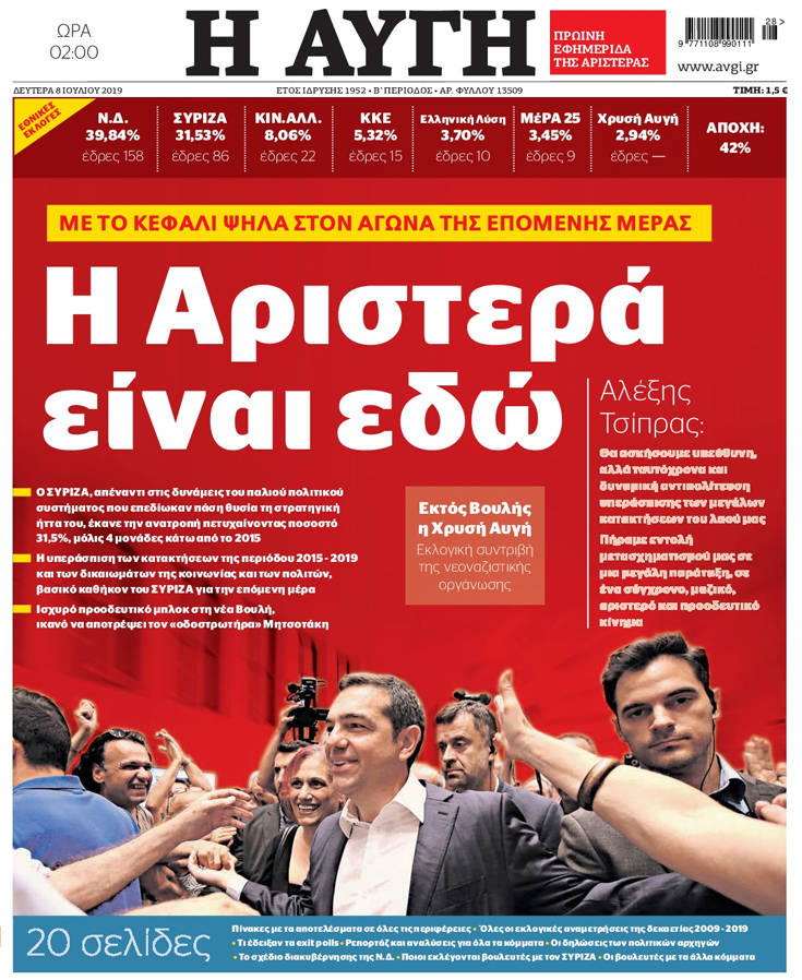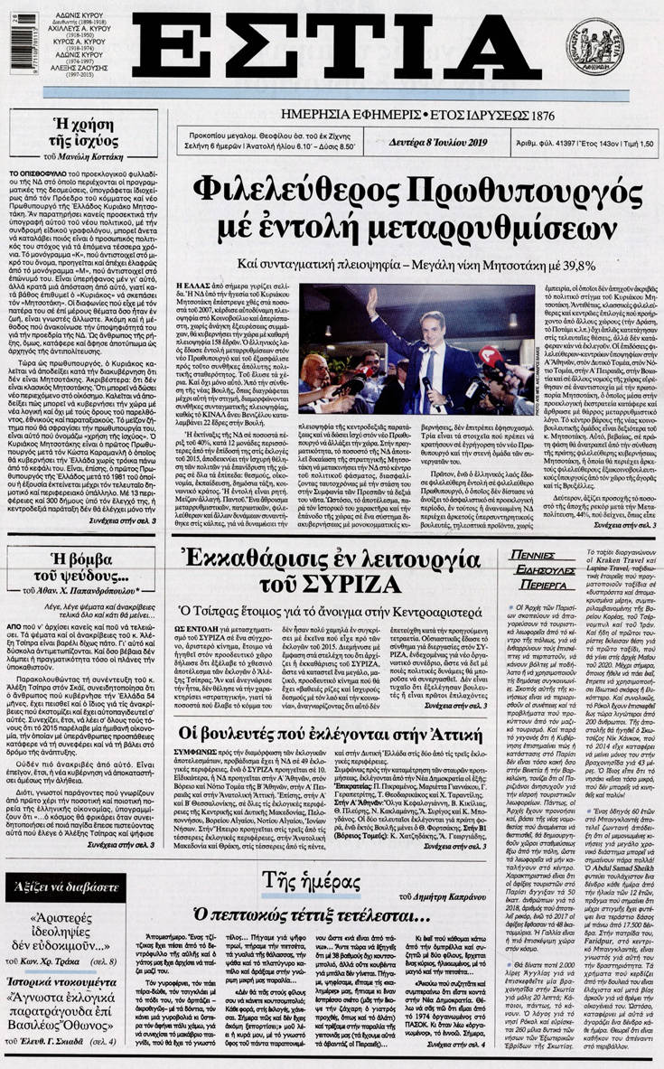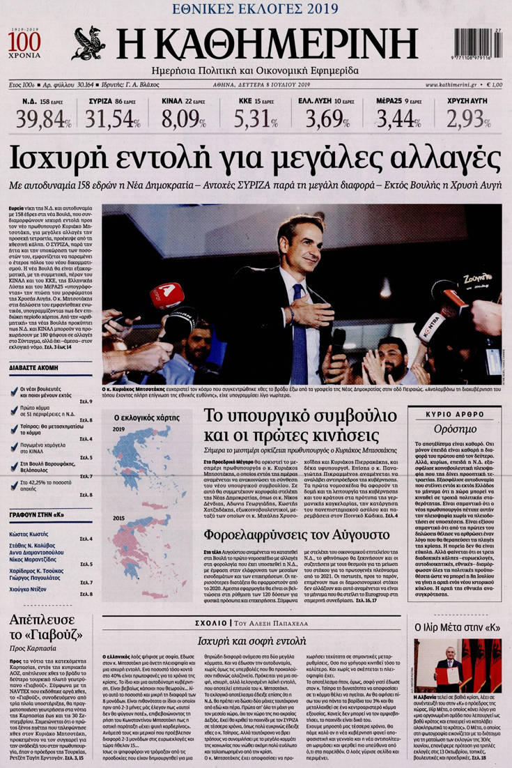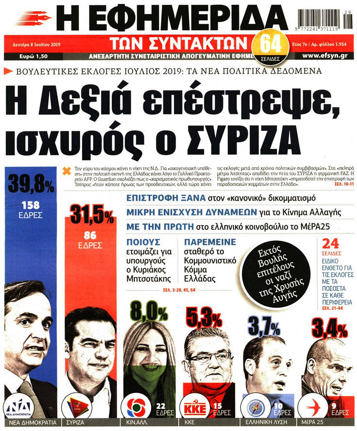 Η νίκη της Νέας Δημοκρατίας στις εθνικές εκλογές, τα υψηλά, παρά την ήττα, ποσοστά του ΣΥΡΙΖΑ, κυριαρχούν στα πρωτοσέλιδα των σημερινών εφημερίδων.