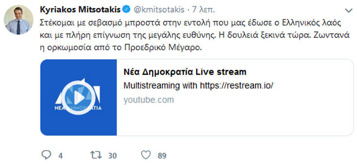«Στέκομαι με σεβασμό μπροστά στην εντολή που μας έδωσε ο Ελληνικός λαός και με πλήρη επίγνωση της μεγάλης ευθύνης. Η δουλειά ξεκινά τώρα»: τα λόγια αυτά έγραψε στον προσωπικό του λογαριασμό στο Twitter ο πρωθυπουργός Κυριάκος Μητσοτάκης, παραπέμποντας στην ορκωμοσία που είναι σε εξέλιξη στο Προεδρικό Μέγαρο.