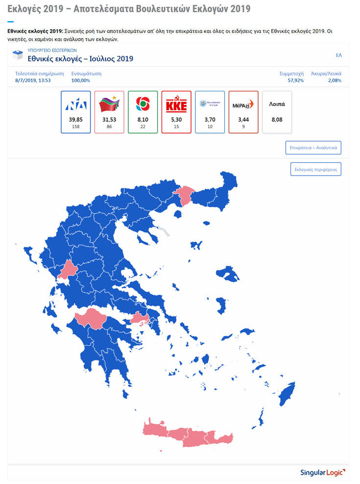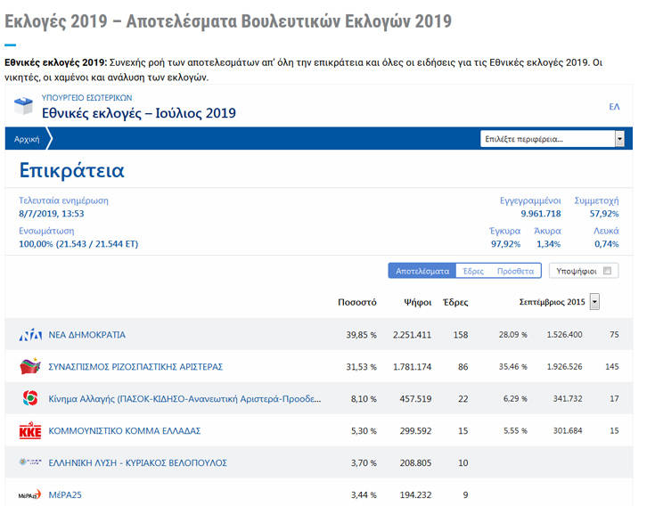 Με το 100% της ενσωμάτωσης των ψήφων από τις εθνικές εκλογές της 7ης Ιουλίου καταγεγραμμένες, έκλεισε και οριστικά η διαφορά μεταξύ της ΝΔ και του ΣΥΡΙΖΑ, ποια κόμματα μπαίνουν στη Βουλή αλλά και ο αριθμός των εδρών που καταλαμβάνει κάθε παράταξη.