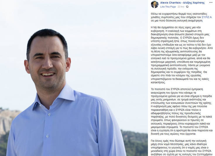 Παρακάτω η ανάρτηση του βουλευτή ΣΥΡΙΖΑ – Προοδευτική Συμμαχία Μεσσηνίας Αλέξη Χαρίτση την επομένη των εκλογών ο οποίος στο μήνυμά του μεταξύ άλλων ανέφερε: