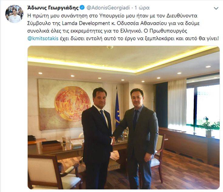Όπως αναφέρει ο υπουργός σε ανάρτησή του στο Twitter, «η πρώτη μου συνάντηση στο υπουργείο μου ήταν με τον διευθύνοντα σύμβουλο της Lamda Development κ. Οδυσσέα Αθανασίου για να δούμε συνολικά όλες τις εκκρεμότητες για το Ελληνικό. Ο πρωθυπουργός Κυριάκος Μητσοτάκης έχει δώσει εντολή αυτό το έργο να ξεμπλοκάρει και αυτό θα γίνει!».