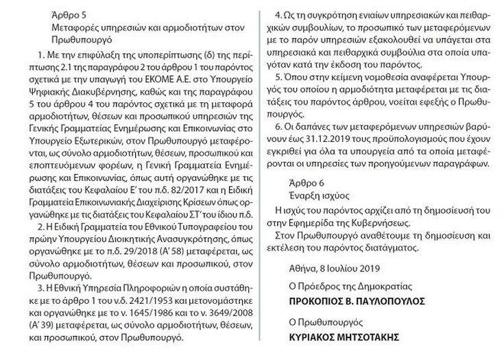 Με το προεδρικό διάταγμα που δημοσιεύτηκε την Δευτέρα στην Εφημερίδα της Κυβερνήσεως, έγινε γνωστό πως στο εξής στον πρωθυπουργό θα υπάγονται, πλέον, τόσο η Εθνική Υπηρεσία Πληροφοριών όσο και η Γενική Γραμματεία Ενημέρωση.