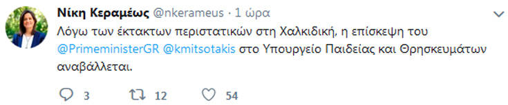 Επίσης η υπουργός Παιδείας Νίκη Κεραμέως, με σχόλιο στο Twitter, ενημέρωσε για την αναβολή της επίσκεψης του Κυριάκου Μητσοτάκη στο υπουργείο Παιδείας που ήταν προγραμματισμένη για σήμερα στις 11:30.