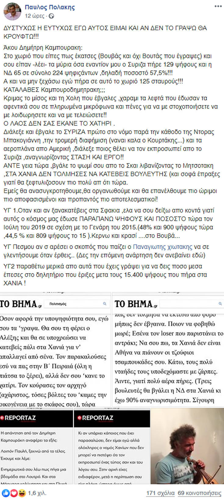 ΥΓ2 παραθέτω μερικά από αυτά που έχεις γράψει για να δεις πόσο μέσα έπεσες στο δηλητήριο που έριξες μετά τους 15.400 ψήφους που πήρα στα ΧΑΝΙΑ!».