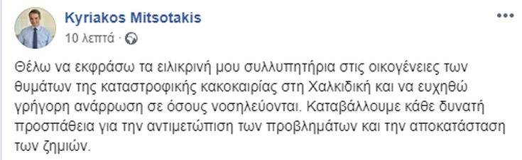 Μέσω μηνύματός του από τον προσωπικό του λογαριασμό στο Facebook, ο Κυριάκος Μητσοτάκης εξέφρασε «τα ειλικρινή μου συλλυπητήρια στις οικογένειες των θυμάτων της καταστροφικής κακοκαιρίας στη Χαλκιδική και να ευχηθώ γρήγορη ανάρρωση σε όσους νοσηλεύονται».