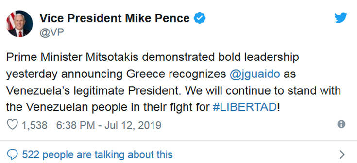 Ο Mάικ Πένς λίγες ώρες μετά την αναγνώριση του Χουάν Γκουαϊδό ως μεταβατικού προέδρου στη Βενεζουέλα, από την κυβέρνηση Μητσοτάκη, έστειλε το δικό του μήνυμα, μέσω του Twitter.