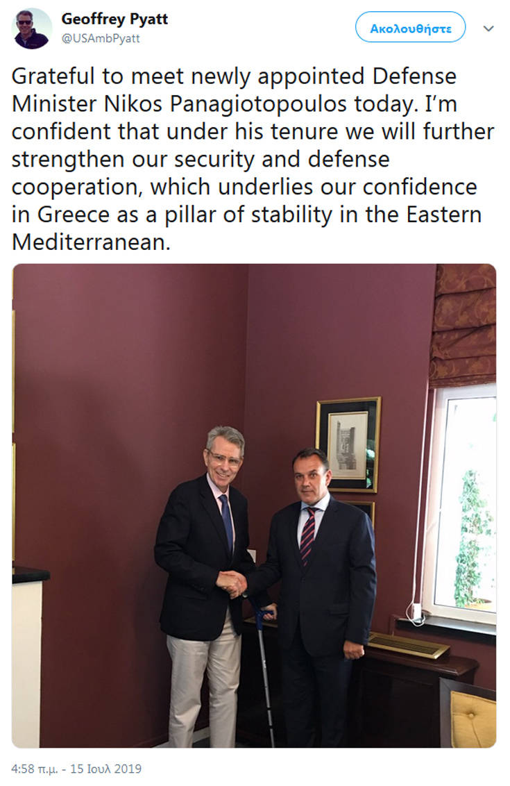 «Είμαι ευγνώμων που συναντήθηκα με τον νέο υπουργό Εθνικής Άμυνας, Νίκο Παναγιωτόπουλο σήμερα. Είμαι βέβαιος ότι κατά τη θητεία του, θα ενισχύσουμε περαιτέρω τη συνεργασία μας στην ασφάλεια και την άμυνα, κάτι που υπογραμμίζει την εμπιστοσύνη μας στην Ελλάδα ως πυλώνα σταθερότητας στην Ανατολική Μεσόγειο» έγραψε ο κ. Πάιατ στον λογαριασμό του στο twitter.