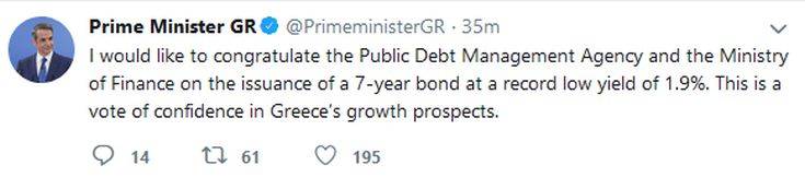 «Συγχαίρω τον Οργανισμό Διαχείρισης Δημοσίου Χρέους και το υπουργείο Οικονομικών για την έκδοση του 7ετούς ομολόγου με το επιτόκιο-ρεκόρ του 1,9%» αναφέρει σε ανάρτησή του στο twitter ο πρωθυπουργός Κυριάκος Μητσοτάκης.