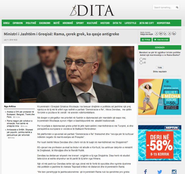 Στις… αλβανικές ρίζες του νέου υπουργού Εξωτερικών της Ελλάδας, Νίκου Δένδια, αναφέρεται αλβανικό δημοσίευμα της εφημερίδας «Dita».