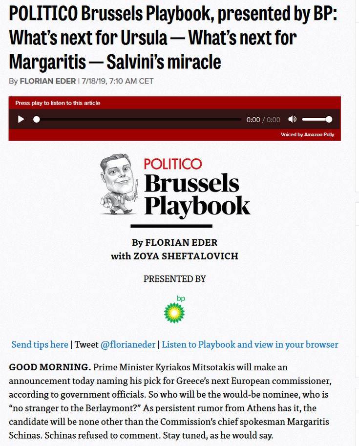 Ειδικότερα, το Politico γράφει: «Ο πρωθυπουργός Κυριάκος Μητσοτάκης θα ανακοινώσει σήμερα την επιλογή του για τον επόμενο Ευρωπαίο Επίτροπο της Ελλάδας, σύμφωνα με κυβερνητικούς αξιωματούχους. Ποιος θα είναι ο υποψήφιος, ο οποίος δεν είναι ξένος στην Κομισιόν;