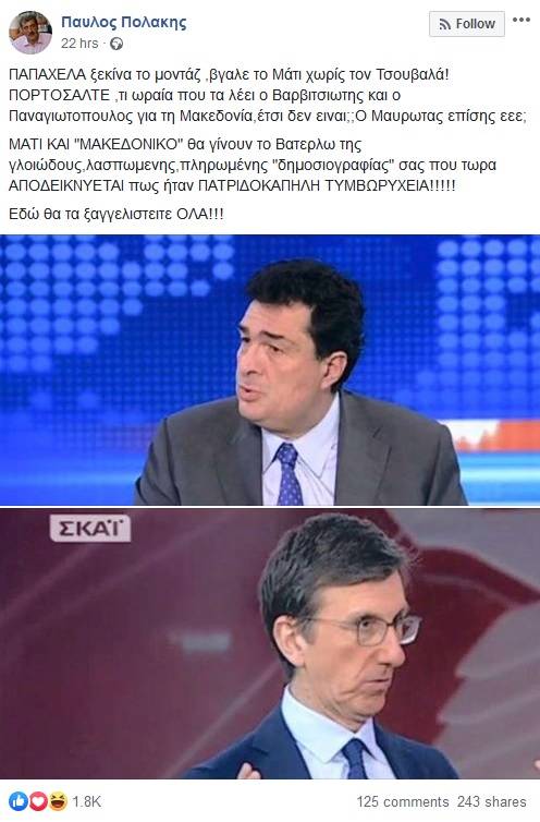 «Παπαχελά ξεκίνα το μοντάζ, βγαλε το Μάτι χωρίς τον Τσουβαλά! Πορτοσάλτε, τι ωραία που τα λέει ο Βαρβιτσιωτης και ο Κυριαζίδης για τη Μακεδονία, έτσι δεν ειναι;; Ο Μαυρωτας επίσης εεε;