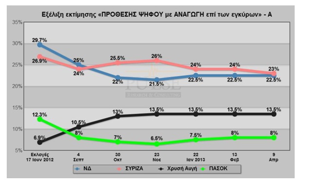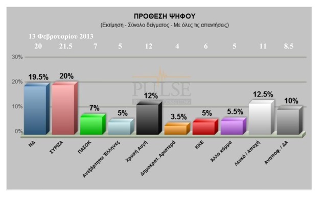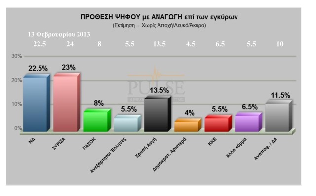 Προβάδισμα κατά 0,5% στο ΣΥΡΙΖΑ, τόσο στην πρόθεση ψήφου όσο και στην αναγωγή της επί των έγκυρων, δίνει νέα δημοσκόπηση της Pulse, για λογαριασμό της εφημερίδας «6μέρες».